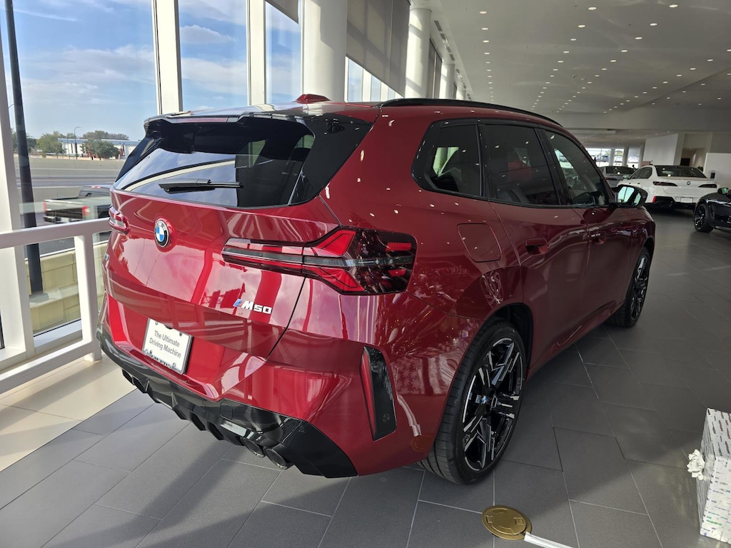 Navigation, Sunroof, Panoramic Roof, All Wheel Drive, Power Liftgate, Turbocharged, Satellite Radio, iPod/MP3 Input, Onboard Communications System, Remote Engine Start, Hands-Free Liftgate, Smart Device Integration, Blind Spot Monitor, Apple CarPlay®, WiFi Hotspot Rear Spoiler, MP3 Player, Keyless Entry, Remote Trunk Release, Privacy Glass. BMW M50 xDrive with Vegas Red Metallic exterior and Black interior features a Straight 6 Cylinder Engine with 393 HP at 5200 RPM*.